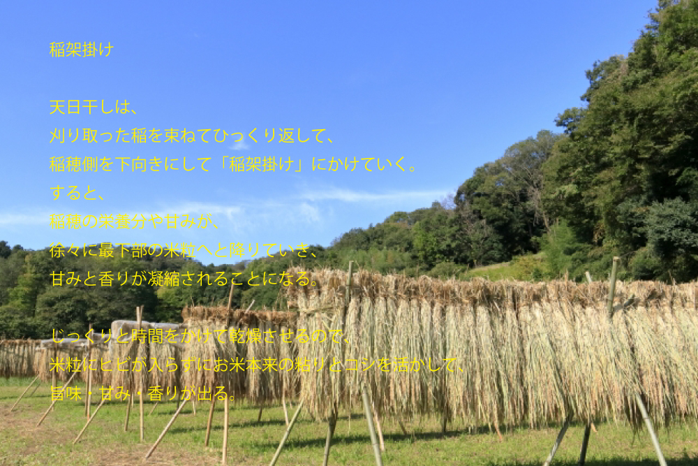 稲穂側を下向きにして「稲架掛け」にかけていきます。